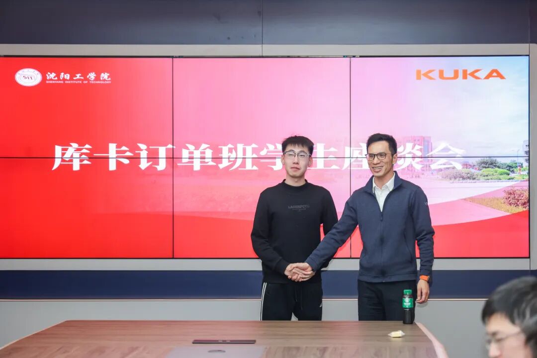 在库卡订单班学生座谈互动环节,同学们围绕个人能力培养、职业发展路径、企业工作环境、课程体系优化及晋升通道建设等问题踊跃提问。库卡中国汽车自动化总经理薛严以“能力是基础,认知是高度”为核心,分享了职业成长的核心逻辑;库卡HRBP总监张宇翔结合自身职业发展经历,介绍了库卡广阔多元的发展前景,为学子们的职业规划提供了宝贵参考。