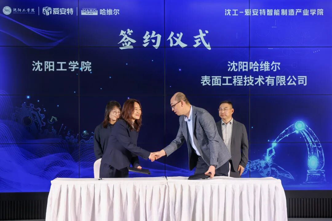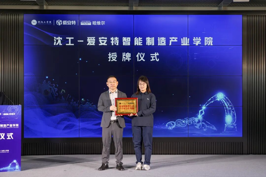 李伟明详细介绍合作项目。产业学院旨在深化产教融合,将企业真实项目深度融入教学全过程,实现“做中学、学中创”。学院创新推行“真实项目+IPD流程”双驱动教学模式,将爱安特的实际模型与企业项目转化为模块化课程与新型活页教材。学生可全程参与从工艺编制、数控编程到零件加工、精度检测的全流程,沉浸式体验企业生产节奏。学院依托“校中厂”生产性平台,引入企业真实产线,并实行“校内导师+企业导师”双导师制,致力于培养高素质应用型人才。启动仪式现场,校企双方领导共同为沈工—爱安特智能制造产业学院揭牌,并签署校企深度合作协议。企业向我校授予“爱安特股份公司产学研合作基地”牌匾、“沈阳哈维尔表面工程技术有限公司产学研合作基地”牌匾,标志着校企合作从战略对接迈入实体化、深度化、常态化运行新阶段。