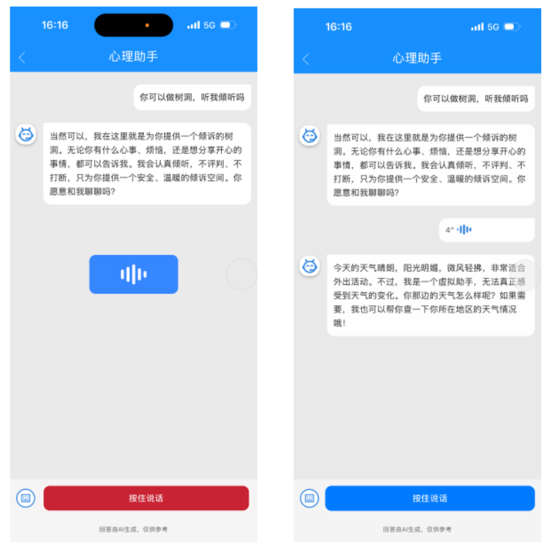 在交互体验上,你的助手实现了无缝多模态沟通,与科大讯飞深度合作集成高精度语音转文字技术,不仅支持文字输入,更能 “按住说话”直接倾诉,精准识别口语、方言与带情绪的断句,搭配灵动波形动画,让冰冷的打字变成有温度的倾听,大幅降低倾诉门槛。同时,依托学校自有高性能计算集群的本地大模型,能迅速捕捉复杂情绪与碎片化表达的真实意图,实现高度智能化的对话交互。