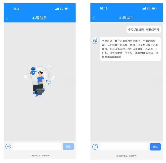 2.点击「心理助手」,选择语音或文字模式,即可开启对话。